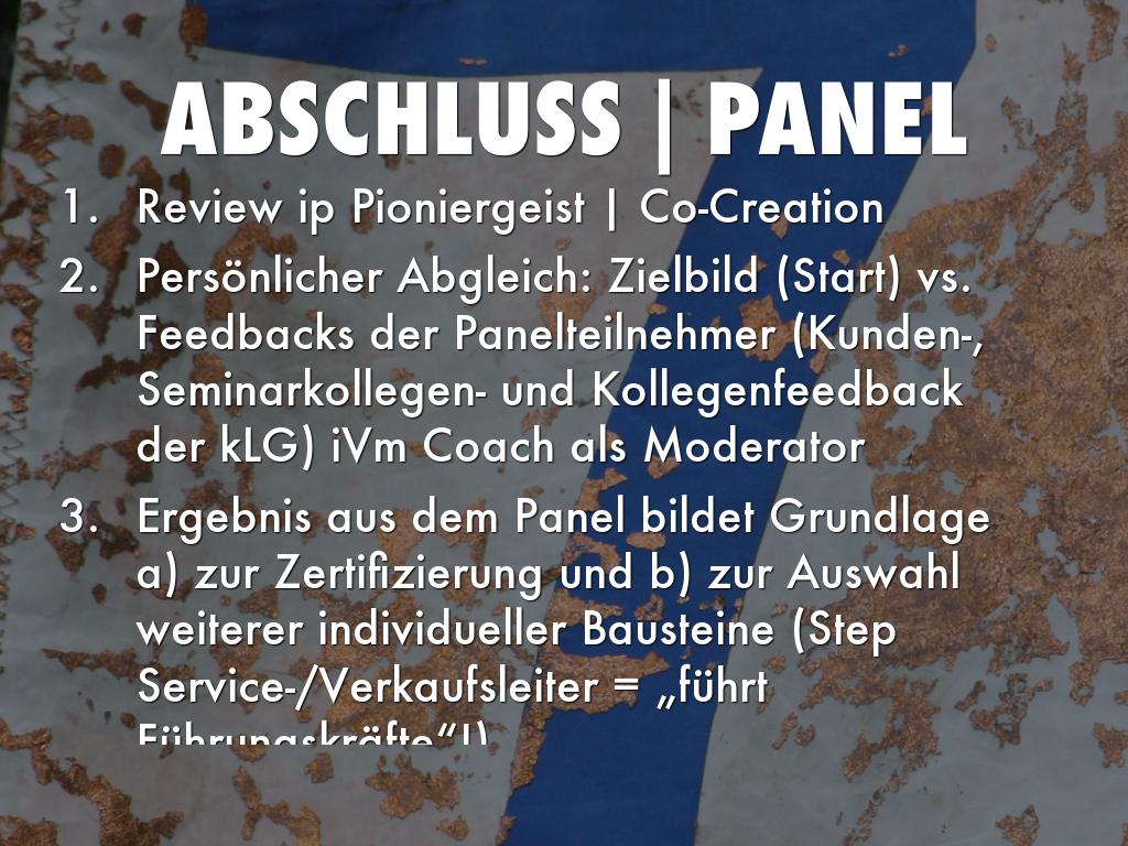 Ergebnis aus dem Panel bildet Grundlage a) zur Zertifizierung und b) zur Auswahl weiterer individueller Bausteine (Step Service-/Verkaufsleiter = „führt Führungskräfte“!)
