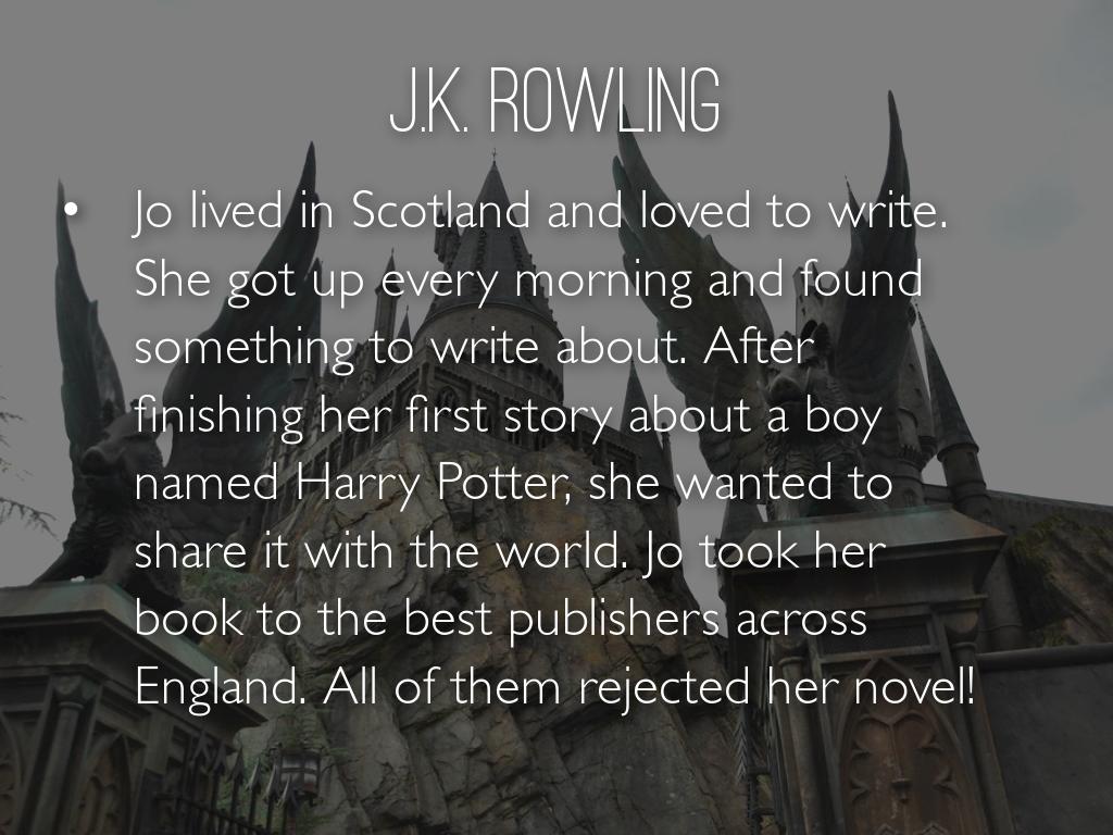 Jo lived in Scotland and loved to write. She got up every morning and found something to write about. After finishing her first story about a boy named Harry Potter, she wanted to share it with the world. Jo took her book to the best publishers across England. All of them rejected her novel!