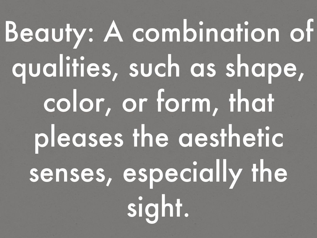 Beauty: A combination of qualities, such as shape, color, or form, that pleases the aesthetic senses, especially the sight.