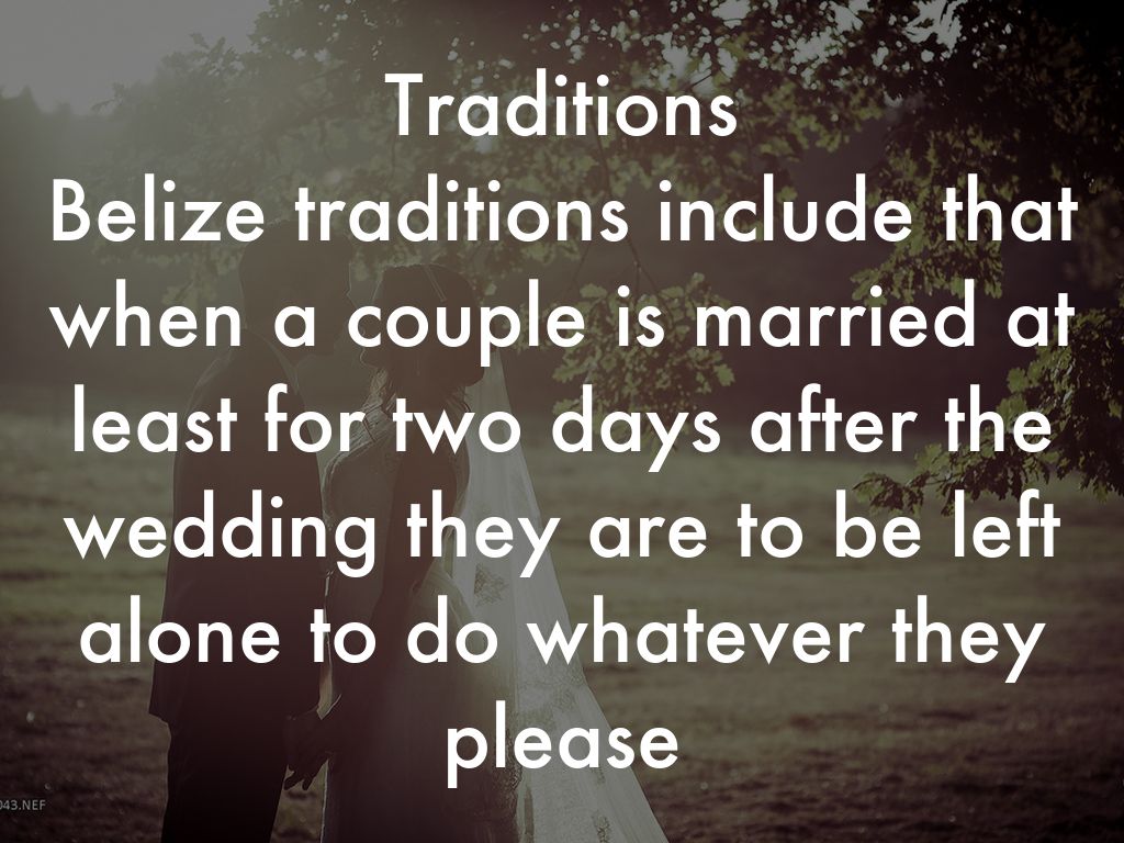 Traditions Belize traditions include that when a couple is married at least for two days after the wedding they are to be left alone to do whatever they please
