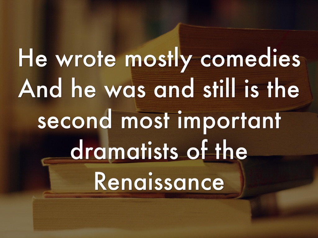 He wrote mostly comedies And he was and still is the second most important dramatists of the Renaissance