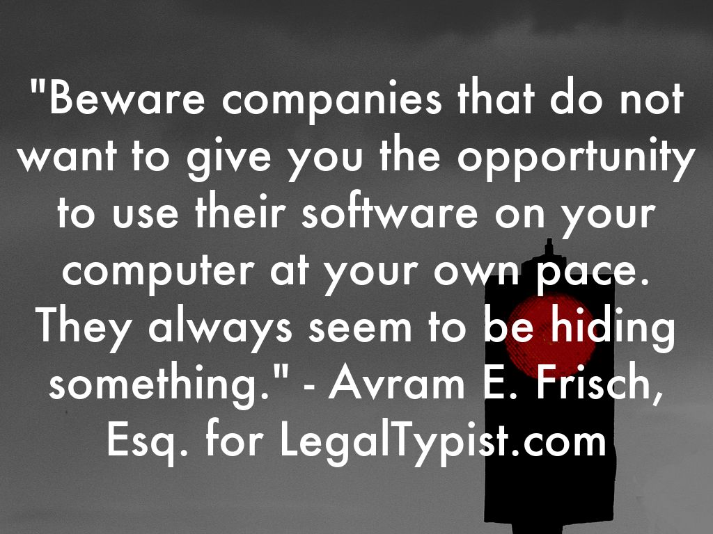 "Beware companies that do not want to give you the opportunity to use their software on your computer at your own pace. They always seem to be hiding something." - Avram E. Frisch, Esq. for