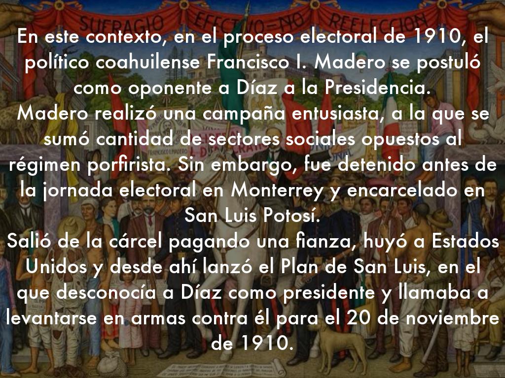 En este contexto, en el proceso electoral de 1910, el político coahuilense Francisco I. Madero se postuló como oponente a Díaz a la Presidencia.
