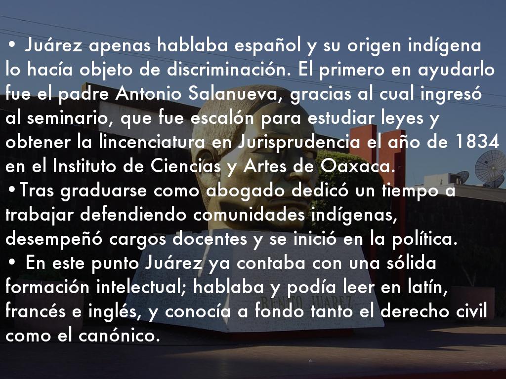 • Juárez apenas hablaba español y su origen indígena lo hacía objeto de discriminación. El primero en ayudarlo fue el padre Antonio Salanueva, gracias al cual ingresó al seminario, que fue escalón para estudiar leyes y obtener la lincenciatura en Jurisprudencia el año de 1834 en el Instituto de Ciencias y Artes de Oaxaca.