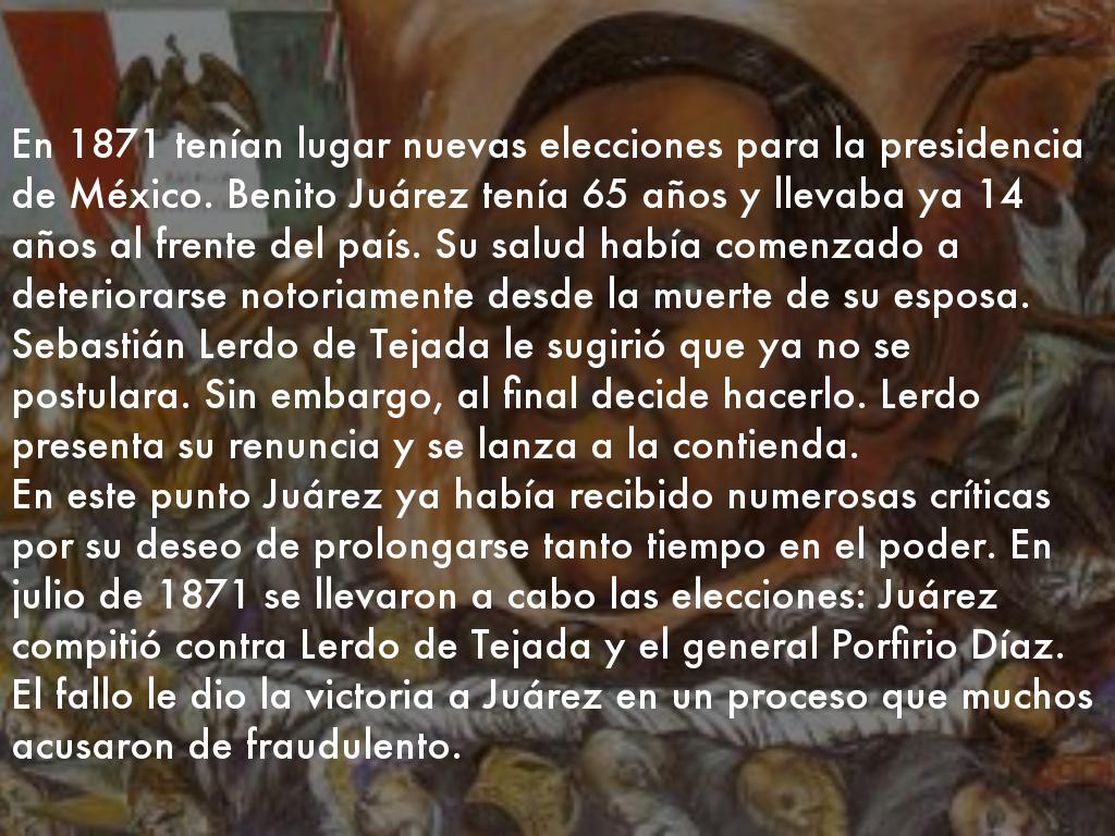 En este punto Juárez ya había recibido numerosas críticas por su deseo de prolongarse tanto tiempo en el poder. En julio de 1871 se llevaron a cabo las elecciones: Juárez compitió contra Lerdo de Tejada y el general Porfirio Díaz. El fallo le dio la victoria a Juárez en un proceso que muchos acusaron de fraudulento.