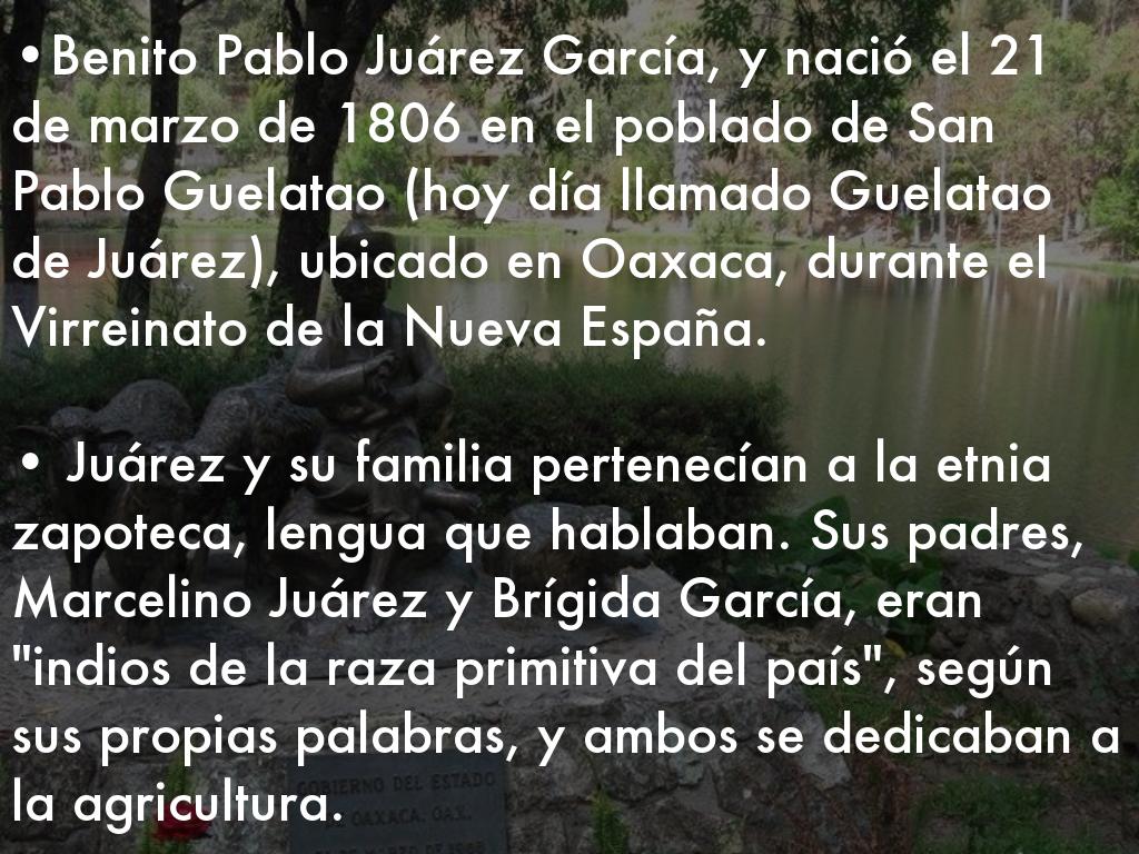 •Benito Pablo Juárez García, y nació el 21 de marzo de 1806 en el poblado de San Pablo Guelatao (hoy día llamado Guelatao de Juárez), ubicado en Oaxaca, durante el Virreinato de la Nueva España.