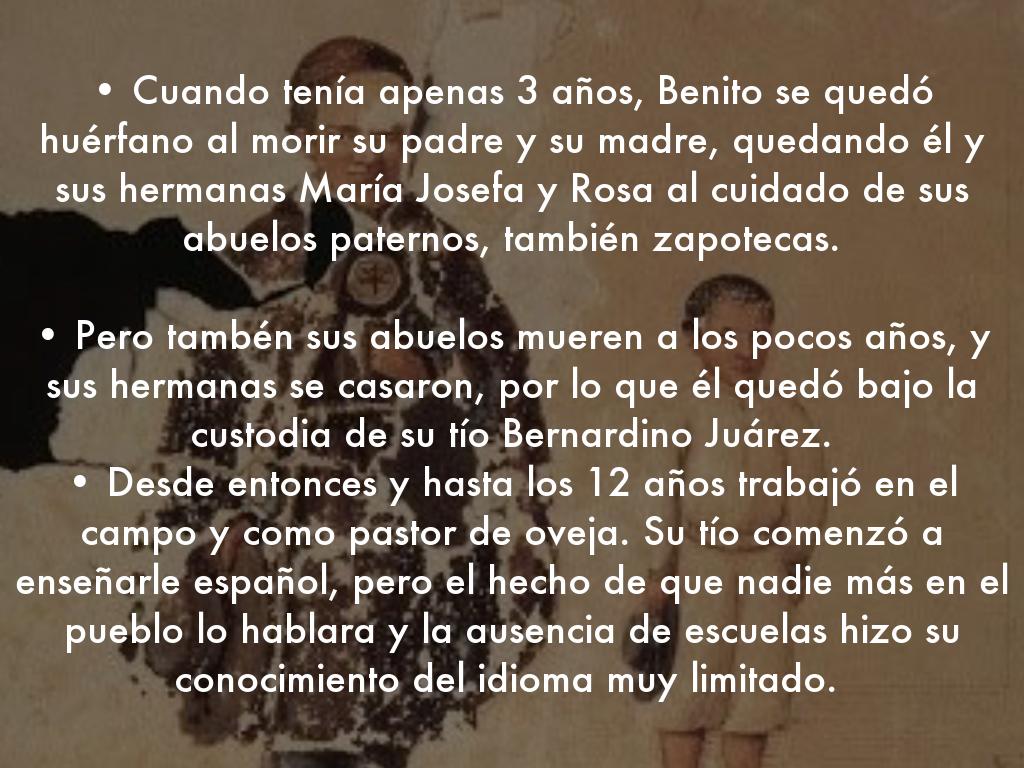 • Cuando tenía apenas 3 años, Benito se quedó huérfano al morir su padre y su madre, quedando él y sus hermanas María Josefa y Rosa al cuidado de sus abuelos paternos, también zapotecas.