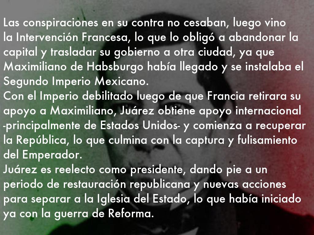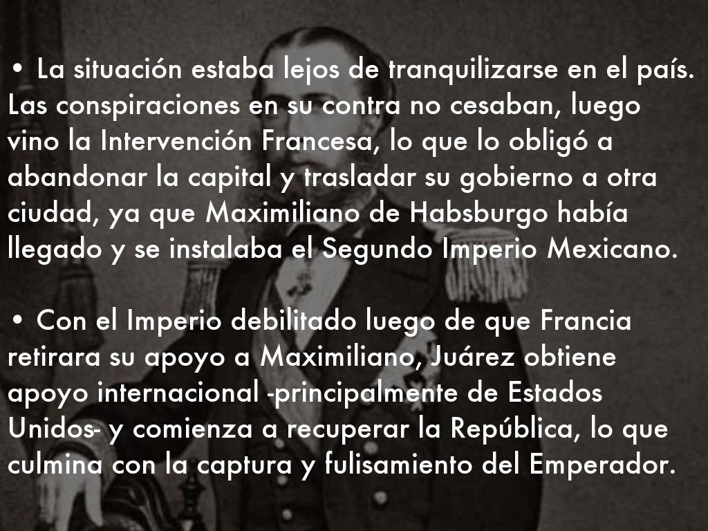 • La situación estaba lejos de tranquilizarse en el país. Las conspiraciones en su contra no cesaban, luego vino la Intervención Francesa, lo que lo obligó a abandonar la capital y trasladar su gobierno a otra ciudad, ya que Maximiliano de Habsburgo había llegado y se instalaba el Segundo Imperio Mexicano.