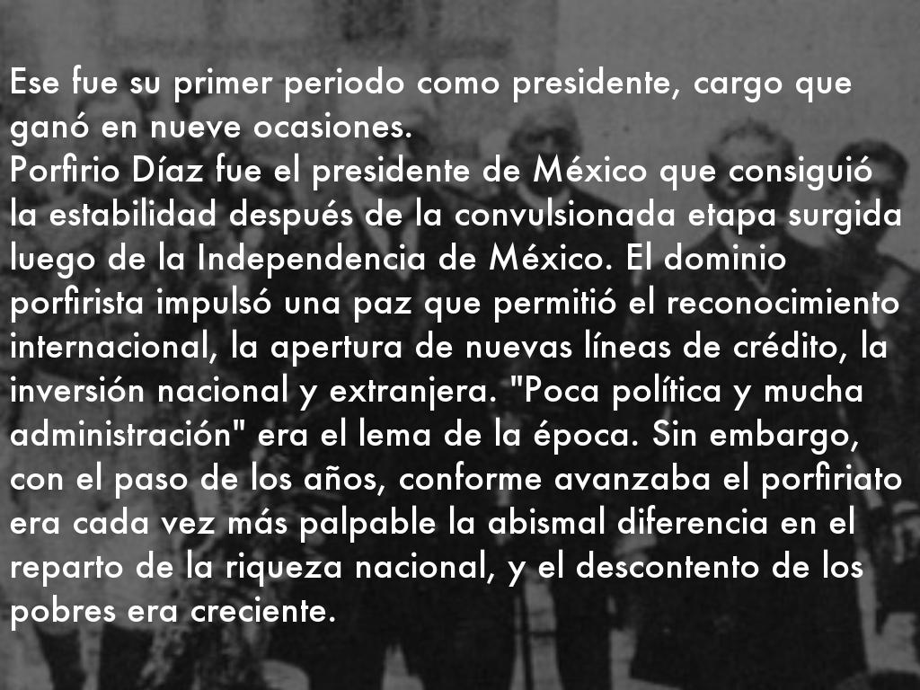 Porfirio Díaz fue el presidente de México que consiguió la estabilidad después de la convulsionada etapa surgida luego de la Independencia de México. El dominio porfirista impulsó una paz que permitió el reconocimiento internacional, la apertura de nuevas líneas de crédito, la inversión nacional y extranjera. "Poca política y mucha administración" era el lema de la época. Sin embargo, con el paso de los años, conforme avanzaba el porfiriato era cada vez más palpable la abismal diferencia en el reparto de la riqueza nacional, y el descontento de los pobres era creciente.