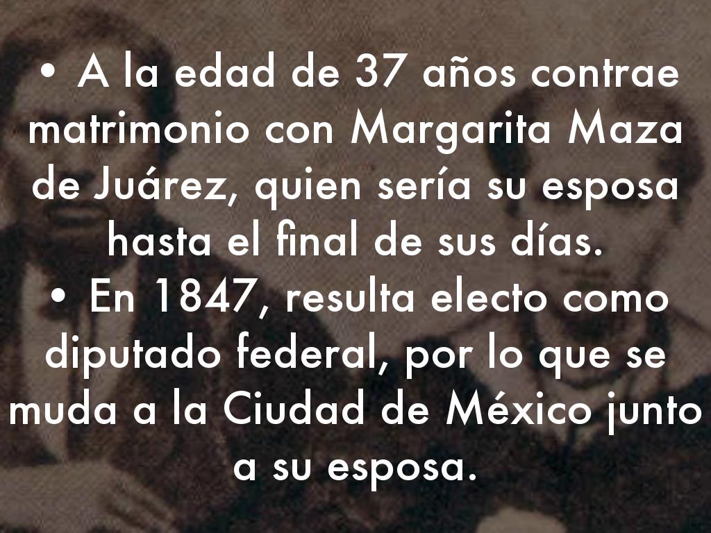 • A la edad de 37 años contrae matrimonio con Margarita Maza de Juárez, quien sería su esposa hasta el final de sus días.