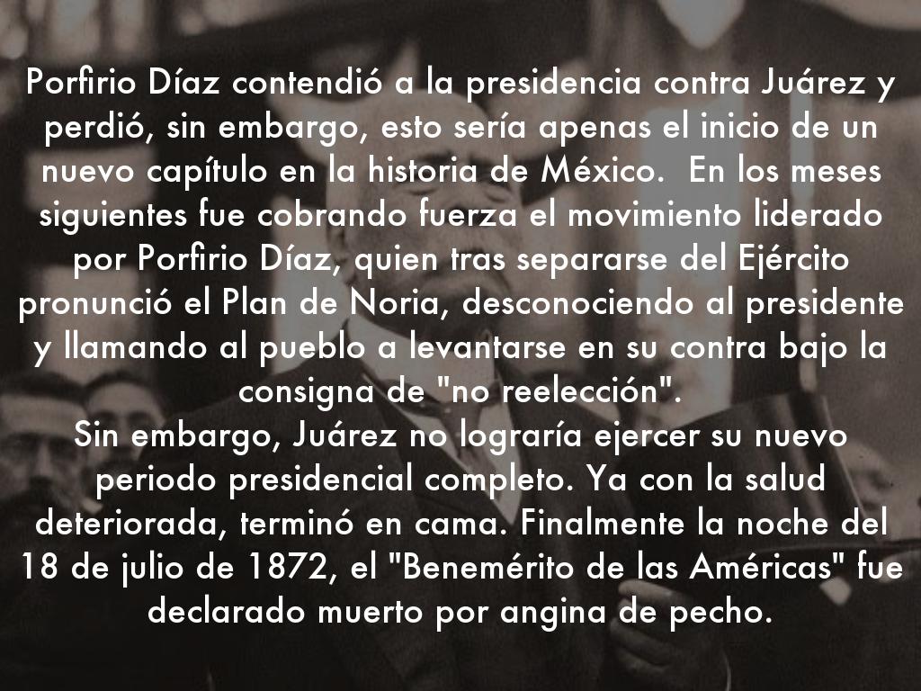 Porfirio Díaz contendió a la presidencia contra Juárez y perdió, sin embargo, esto sería apenas el inicio de un nuevo capítulo en la historia de México. En los meses siguientes fue cobrando fuerza el movimiento liderado por Porfirio Díaz, quien tras separarse del Ejército pronunció el Plan de Noria, desconociendo al presidente y llamando al pueblo a levantarse en su contra bajo la consigna de "no reelección".