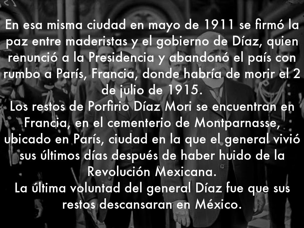 En esa misma ciudad en mayo de 1911 se firmó la paz entre maderistas y el gobierno de Díaz, quien renunció a la Presidencia y abandonó el país con rumbo a París, Francia, donde habría de morir el 2 de julio de 1915.