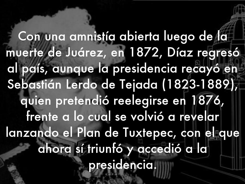 Con una amnistía abierta luego de la muerte de Juárez, en 1872, Díaz regresó al país, aunque la presidencia recayó en Sebastián Lerdo de Tejada (1823-1889), quien pretendió reelegirse en 1876, frente a lo cual se volvió a revelar lanzando el Plan de Tuxtepec, con el que ahora sí triunfó y accedió a la presidencia.