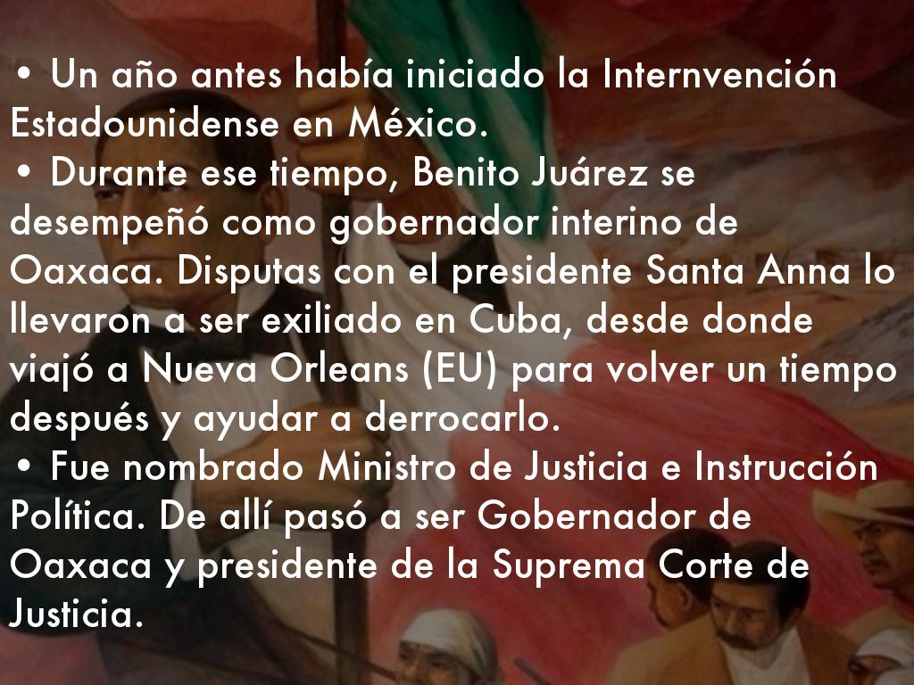 • Durante ese tiempo, Benito Juárez se desempeñó como gobernador interino de Oaxaca. Disputas con el presidente Santa Anna lo llevaron a ser exiliado en Cuba, desde donde viajó a Nueva Orleans (EU) para volver un tiempo después y ayudar a derrocarlo.