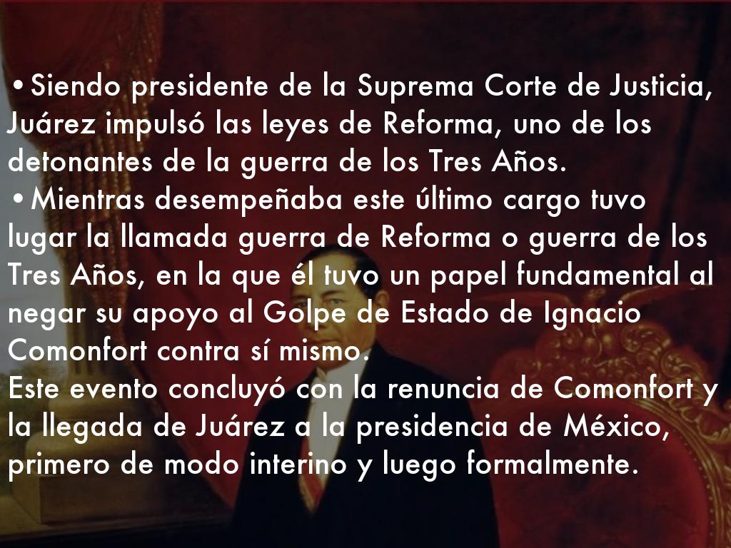 •Siendo presidente de la Suprema Corte de Justicia, Juárez impulsó las leyes de Reforma, uno de los detonantes de la guerra de los Tres Años.