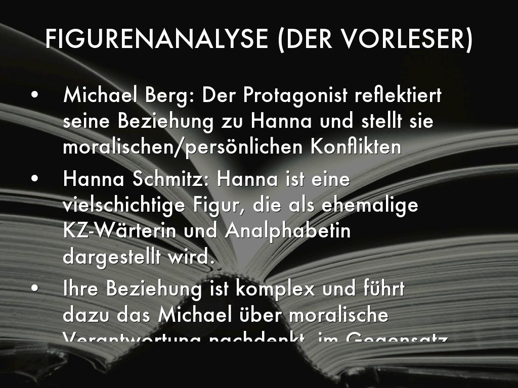 • Michael Berg: Der Protagonist reflektiert seine Beziehung zu Hanna und stellt sie moralischen/persönlichen Konflikten