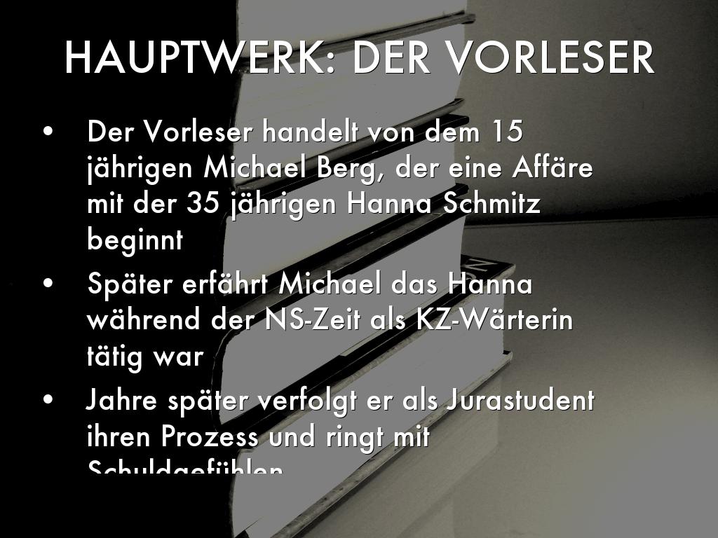 • Der Vorleser handelt von dem 15 jährigen Michael Berg, der eine Affäre mit der 35 jährigen Hanna Schmitz beginnt