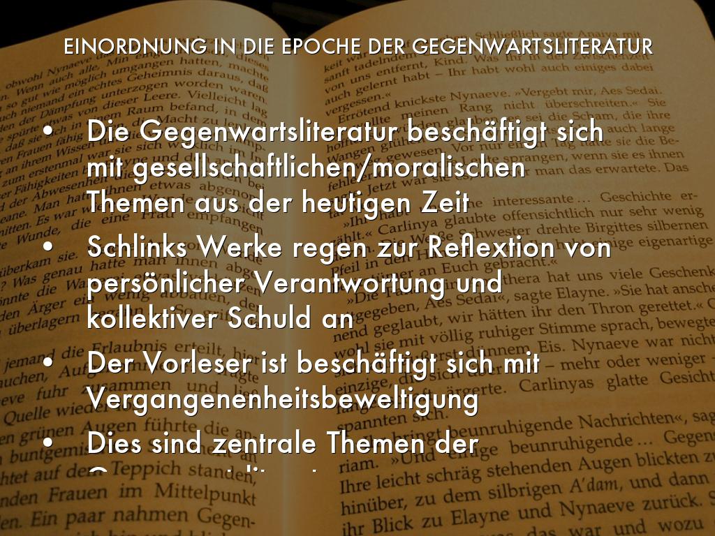 • Der Roman behandelt die Themen Liebe, Schuld, Verantwortung und Vergangenheitsbeweltigung