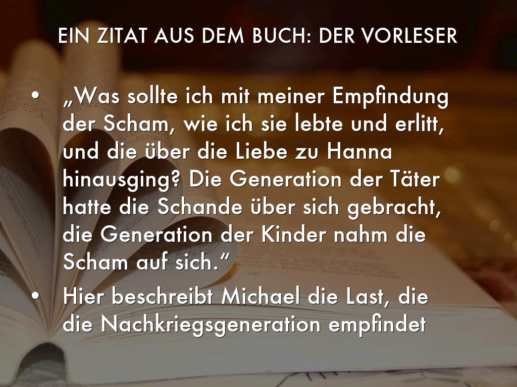 • „Was sollte ich mit meiner Empfindung der Scham, wie ich sie lebte und erlitt, und die über die Liebe zu Hanna hinausging? Die Generation der Täter hatte die Schande über sich gebracht, die Generation der Kinder nahm die Scham auf sich.“