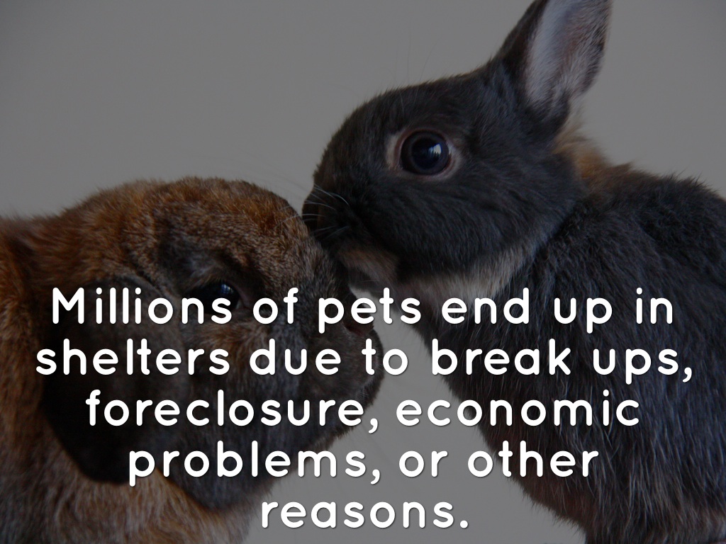Millions of pets end up in shelters due to break ups, foreclosure, economic problems, or other reasons.