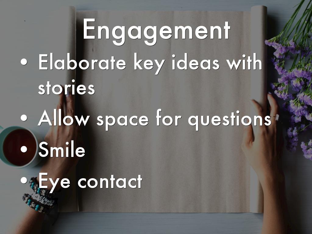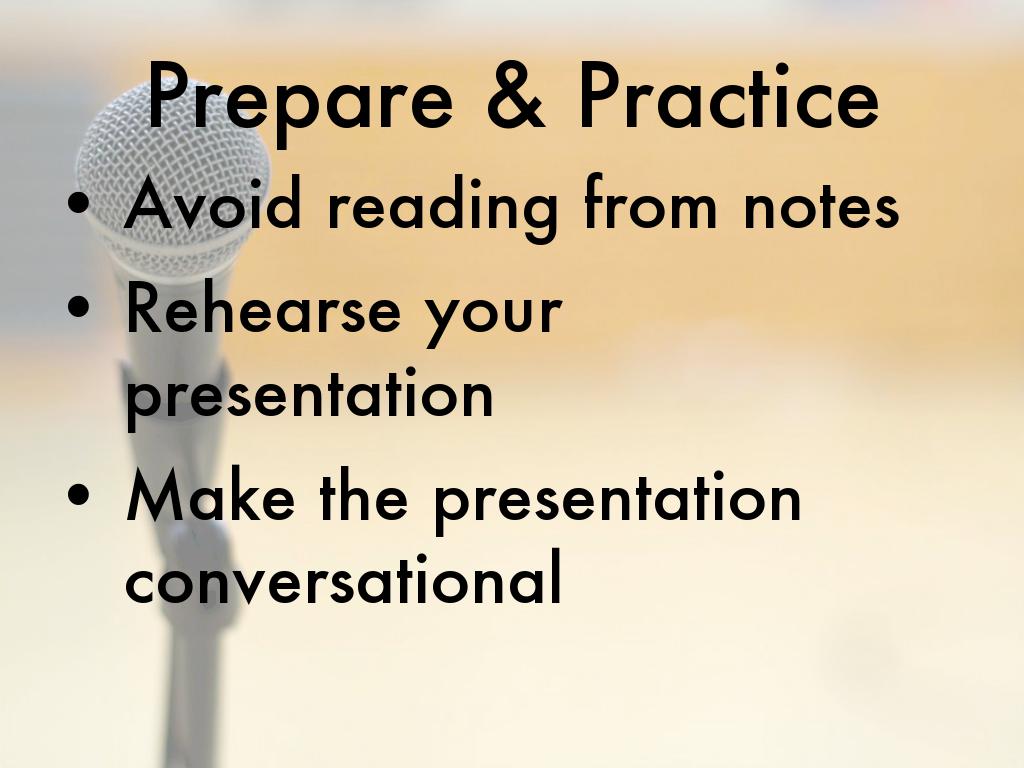 Preparing for a presentation is a key component of a quality presentation. To ensure your audience is engaged, try to make it feel conversational, instead of rehearsed, although you definitely should rehearse it. When you are confident in the material you are presenting, you will be able to present it with a natural demeanor which is more appealing than simply reading.