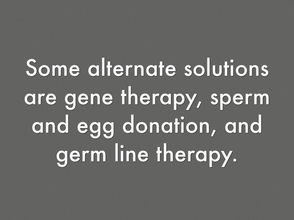 Some alternate solutions are gene therapy, sperm and egg donation, and germ line therapy.