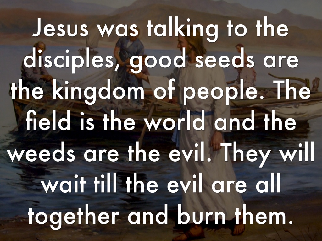 Jesus was talking to the disciples, good seeds are the kingdom of people. The field is the world and the weeds are the evil. They will wait till the evil are all together and burn them.
