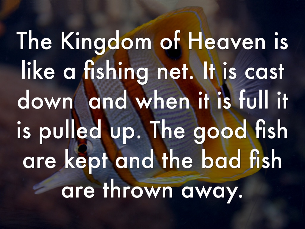 The Kingdom of Heaven is like a fishing net. It is cast down and when it is full it is pulled up. The good fish are kept and the bad fish are thrown away.