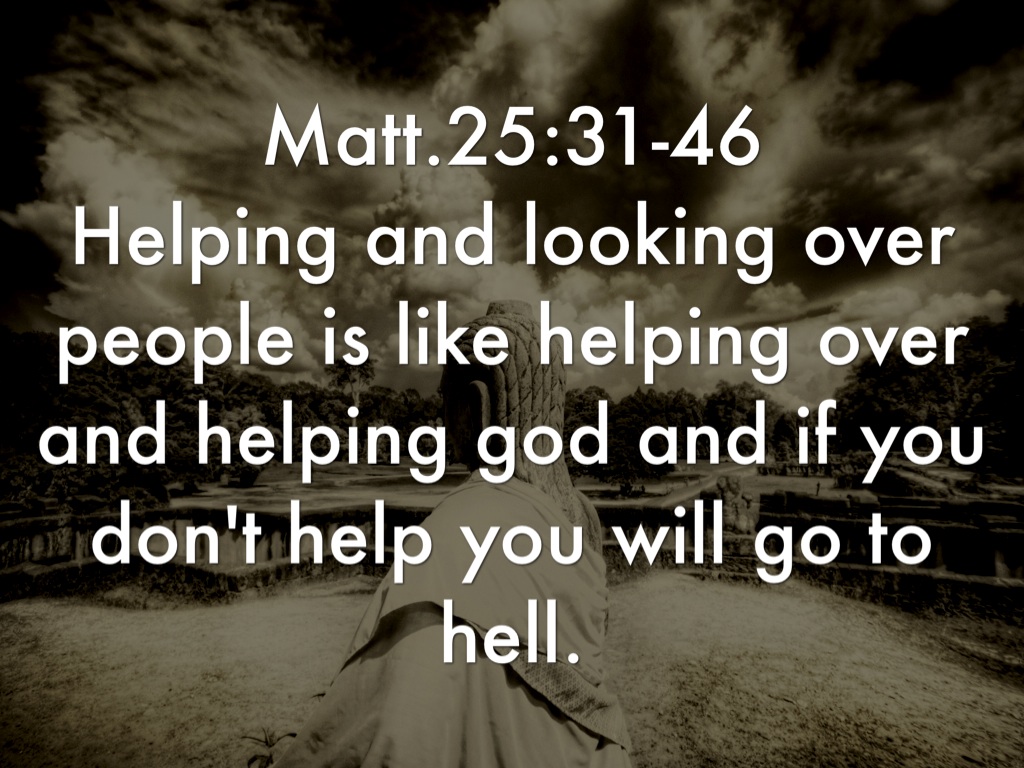 Helping and looking over people is like helping over and helping god and if you don't help you will go to hell.