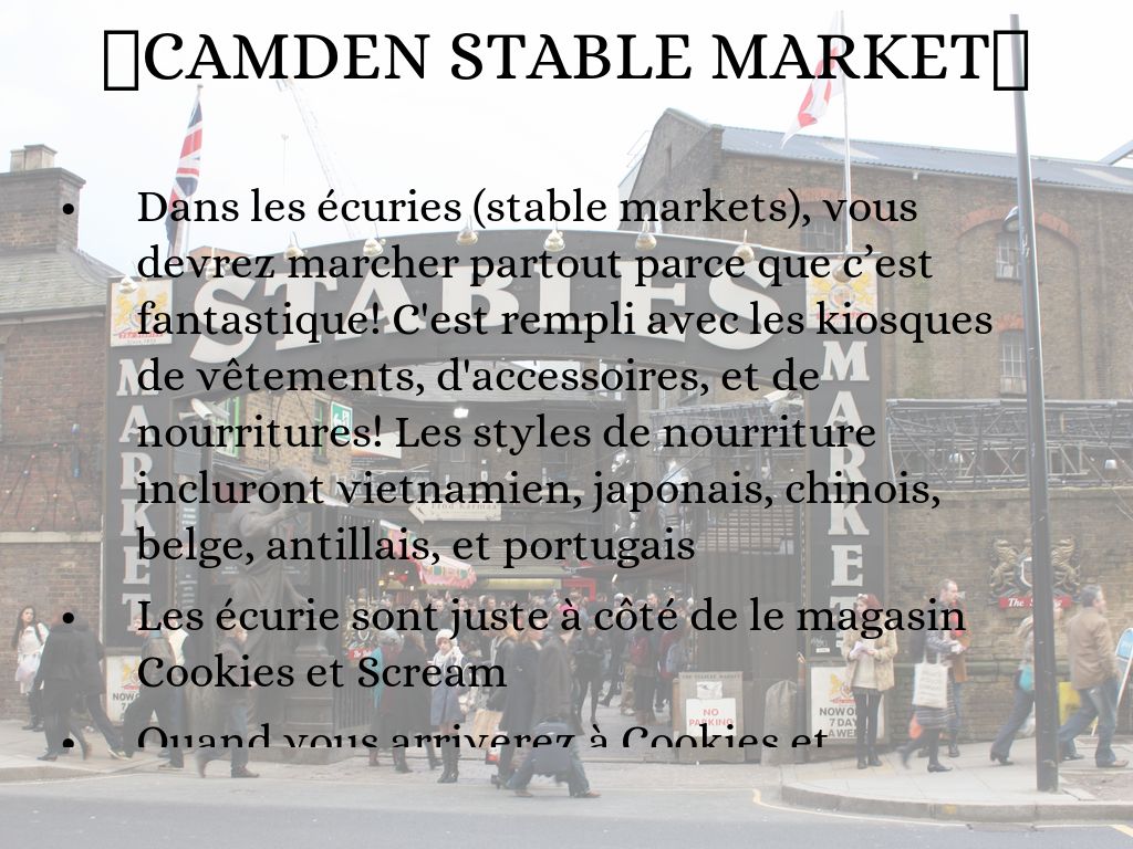 Dans les écuries (stable markets), vous devrez marcher partout parce que c’est fantastique! C'est rempli avec les kiosques de vêtements, d'accessoires, et de nourritures! Les styles de nourriture incluront vietnamien, japonais, chinois, belge, antillais, et portugais