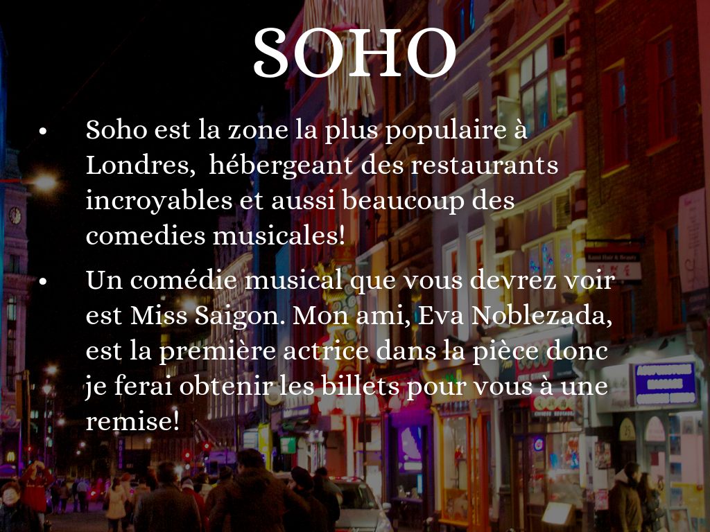 Soho est la zone la plus populaire à Londres, hébergeant des restaurants incroyables et aussi beaucoup des comedies musicales!