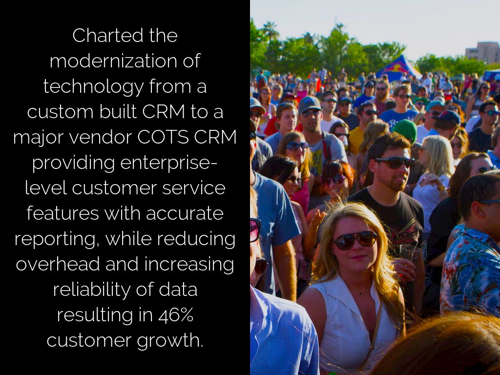 Charted the modernization of technology from a custom built CRM to a major vendor COTS CRM providing enterprise-level customer service features with accurate reporting, while reducing overhead and increasing reliability of data resulting in 46% customer growth.