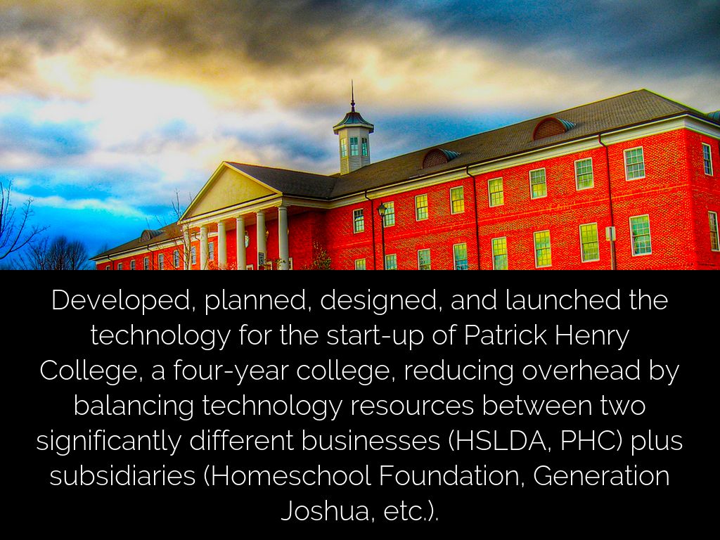 Developed, planned, designed, and launched the technology for the start-up of Patrick Henry College, a four-year college, reducing overhead by balancing technology resources between two significantly different businesses (HSLDA, PHC) plus subsidiaries (Homeschool Foundation, Generation Joshua, etc.).