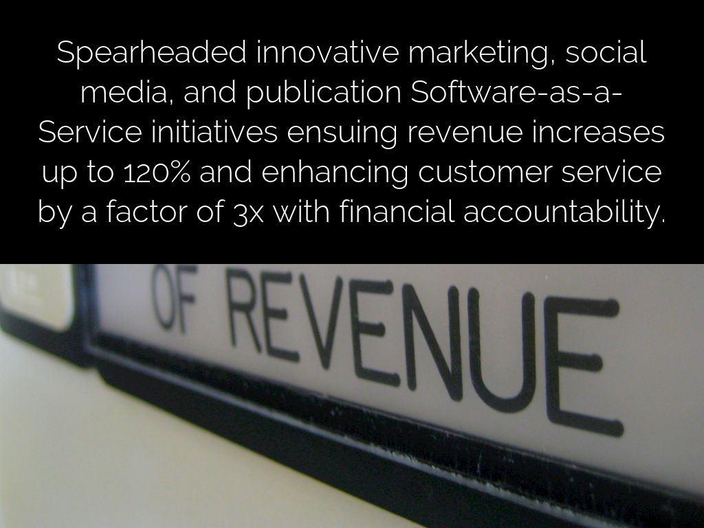 Spearheaded innovative marketing, social media, and publication Software-as-a-Service initiatives ensuing revenue increases up to 120% and enhancing customer service by a factor of 3x with financial accountability.