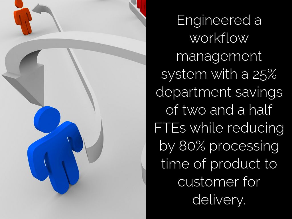 Engineered a workflow management system with a 25% department savings of two and a half FTEs while reducing by 80% processing time of product to customer for delivery.