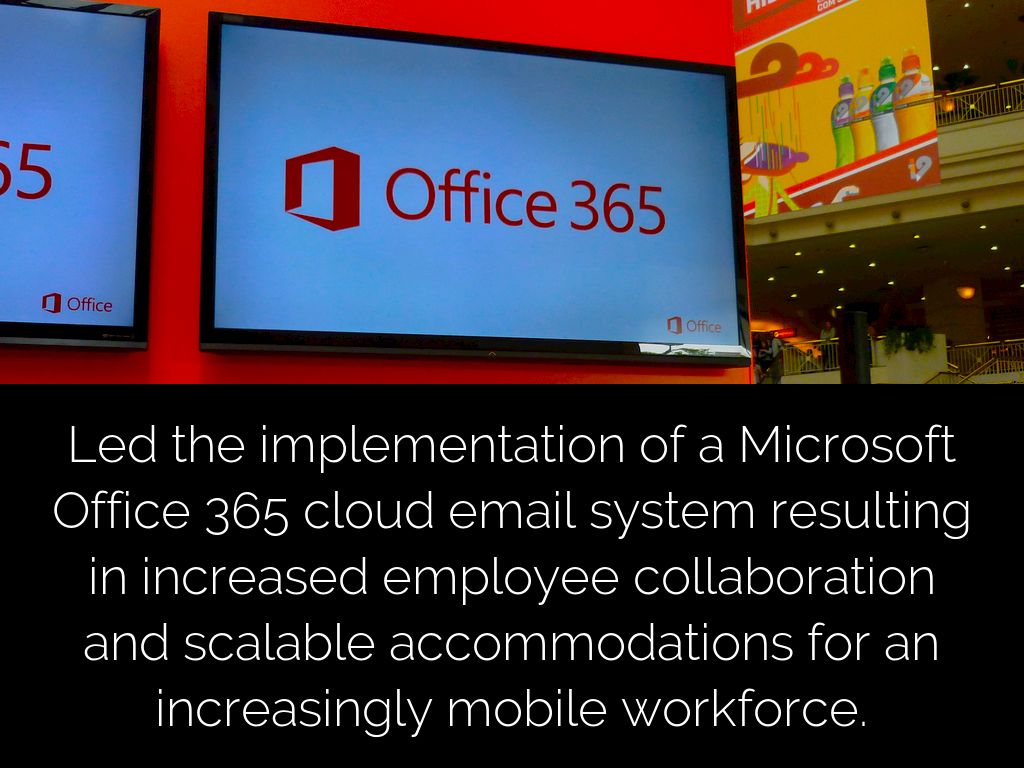 Led the implementation of a Microsoft Office 365 cloud email system resulting in increased employee collaboration and scalable accommodations for an increasingly mobile workforce.
