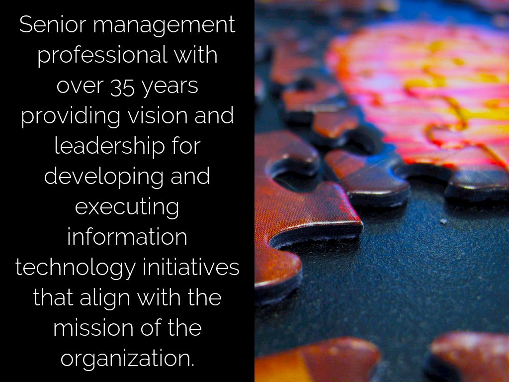 Senior management professional with over 35 years providing vision and leadership for developing and executing information technology initiatives that align with the mission of the organization.