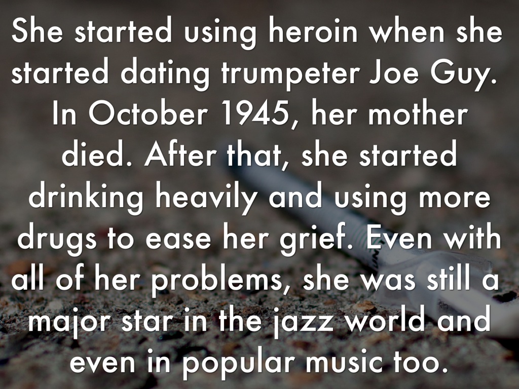 She started using heroin when she started dating trumpeter Joe Guy. In October 1945, her mother died. After that, she started drinking heavily and using more drugs to ease her grief. Even with all of her problems, she was still a major star in the jazz world and even in popular music too.