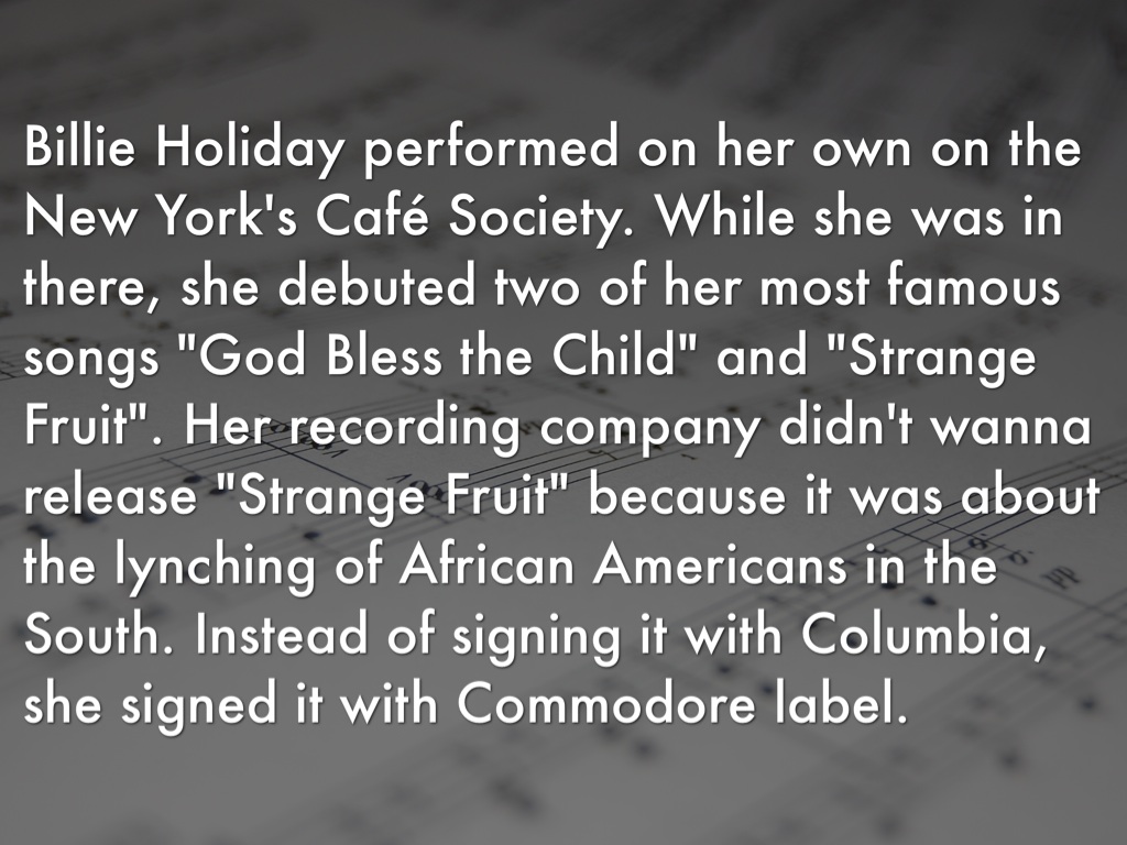 Billie Holiday performed on her own on the New York's Café Society. While she was in there, she debuted two of her most famous songs "God Bless the Child" and "Strange Fruit". Her recording company didn't wanna release "Strange Fruit" because it was about the lynching of African Americans in the South. Instead of signing it with Columbia, she signed it with Commodore label.