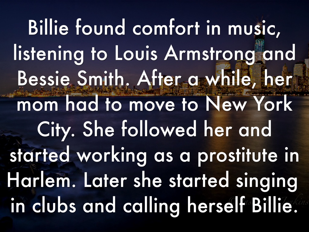 Billie found comfort in music, listening to Louis Armstrong and Bessie Smith. After a while, her mom had to move to New York City. She followed her and started working as a prostitute in Harlem. Later she started singing in clubs and calling herself Billie.