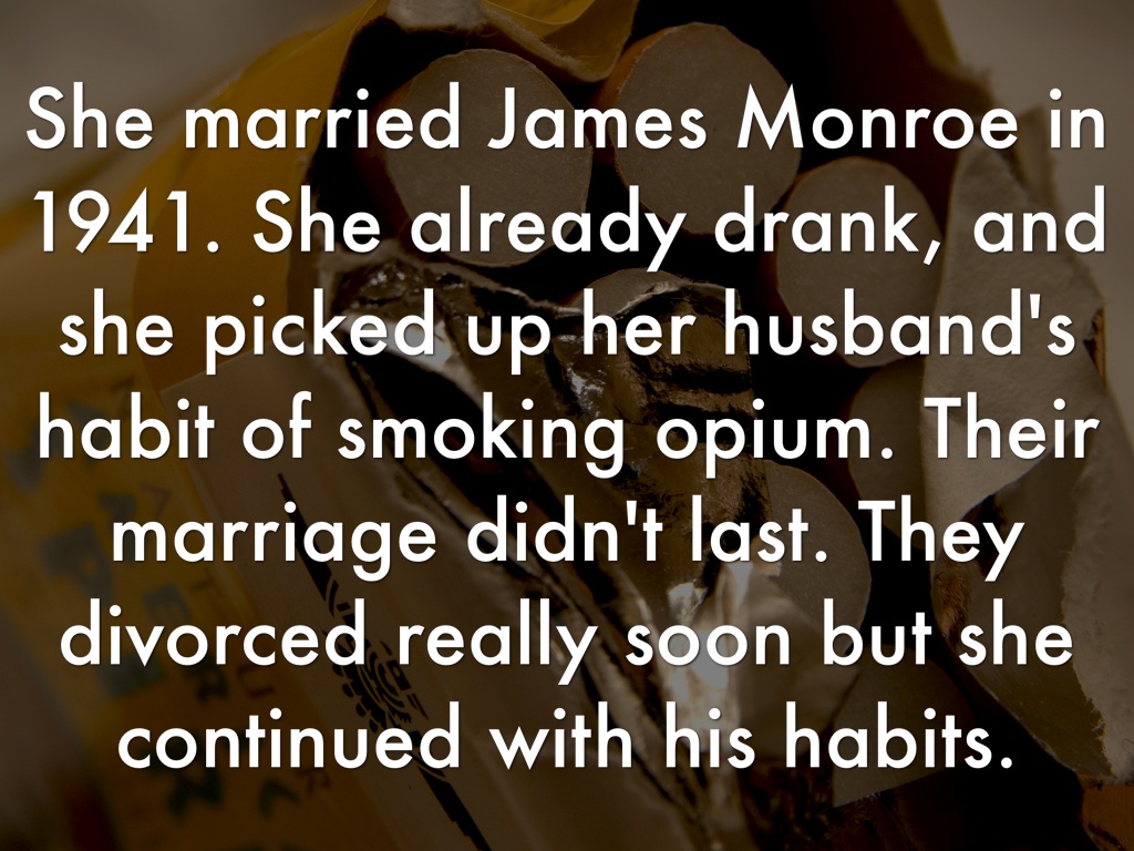 She married James Monroe in 1941. She already drank, and she picked up her husband's habit of smoking opium. Their marriage didn't last. They divorced really soon but she continued with his habits.
