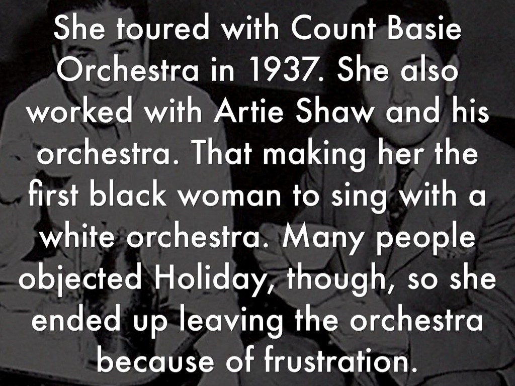 She toured with Count Basie Orchestra in 1937. She also worked with Artie Shaw and his orchestra. That making her the first black woman to sing with a white orchestra. Many people objected Holiday, though, so she ended up leaving the orchestra because of frustration.
