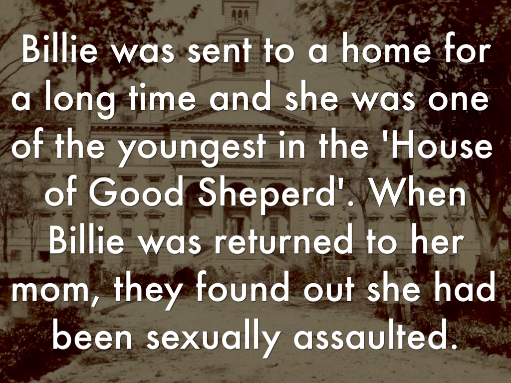Billie was sent to a home for a long time and she was one of the youngest in the 'House of Good Sheperd'. When Billie was returned to her mom, they found out she had been sexually assaulted.