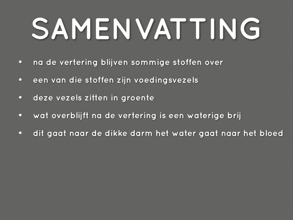 • dit gaat naar de dikke darm het water gaat naar het bloed