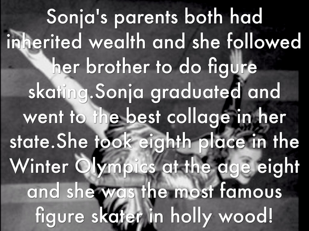 Sonja's parents both had inherited wealth and she followed her brother to do figure skating.Sonja graduated and went to the best collage in her state.She took eighth place in the Winter Olympics at the age eight and she was the most famous figure skater in holly wood!