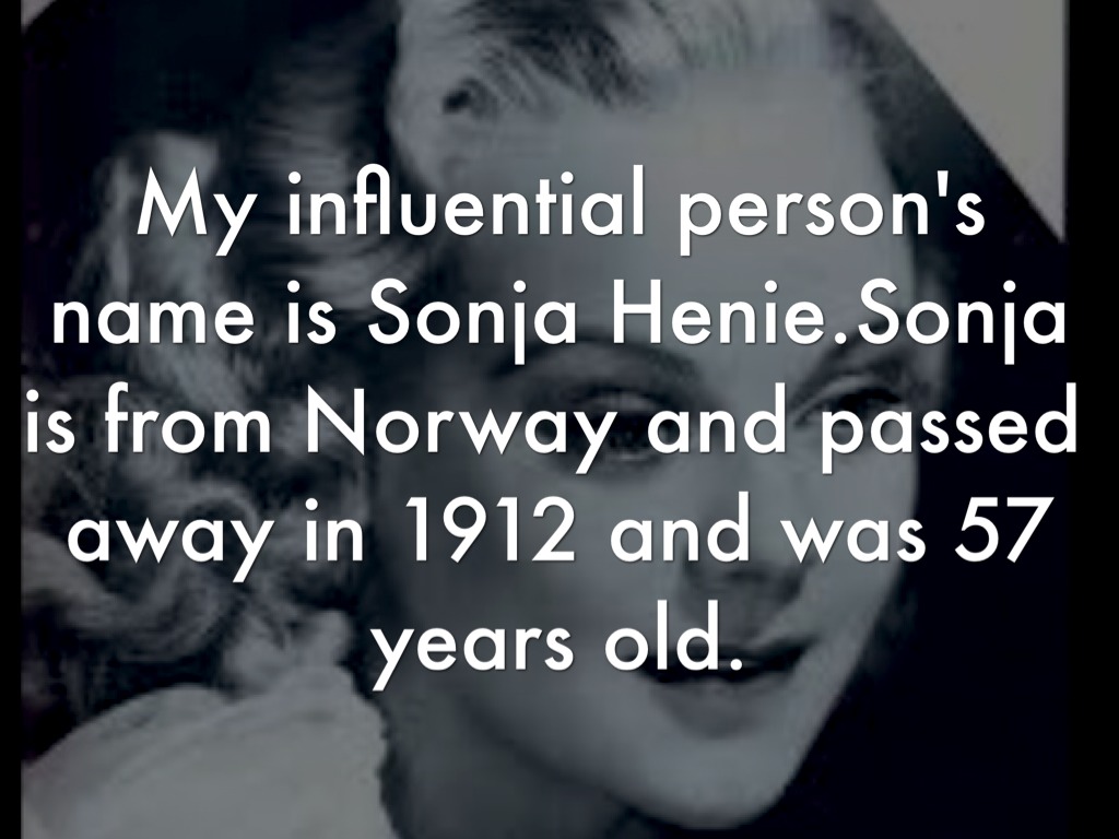 My influential person's name is Sonja Henie.Sonja is from Norway and passed away in 1912 and was 57 years old.