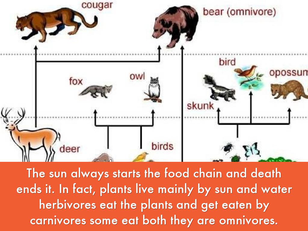 The sun always starts the food chain and death ends it. In fact, plants live mainly by sun and water herbivores eat the plants and get eaten by carnivores some eat both they are omnivores.