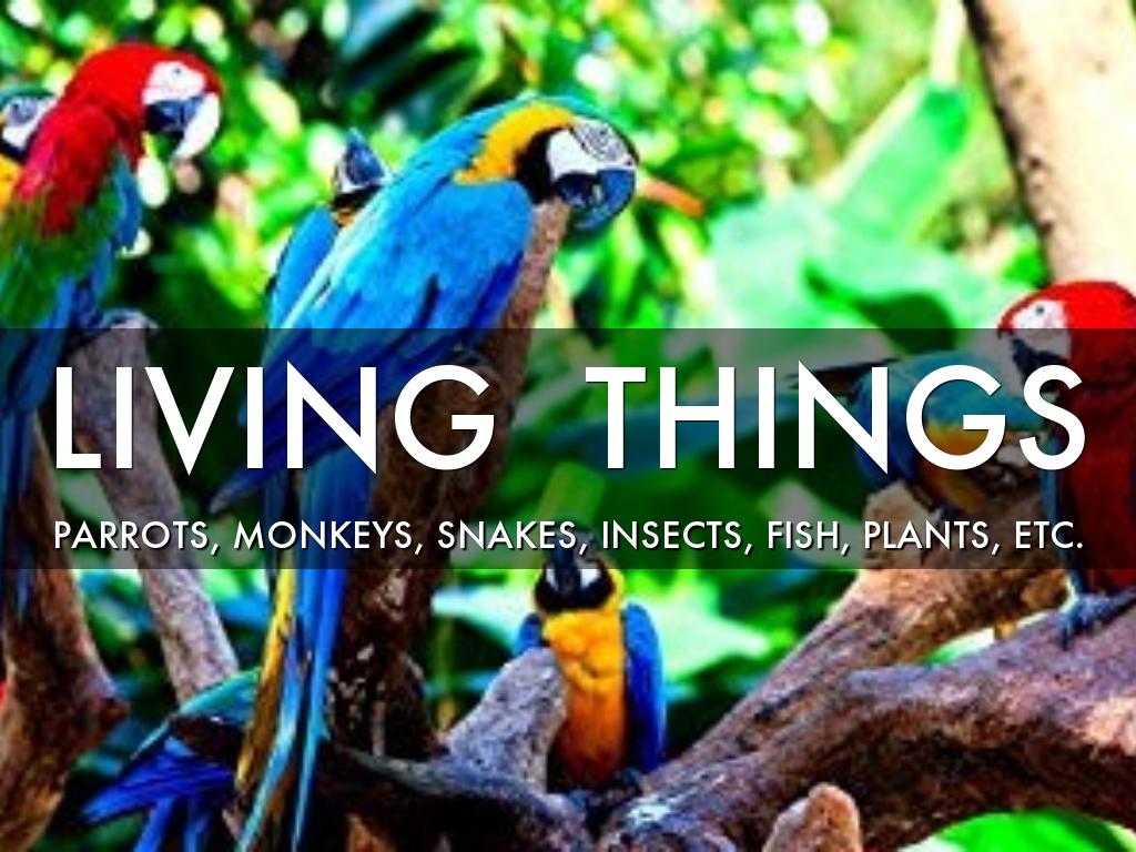 Parrots, Monkeys, Snakes, insects, Fish, Plants, etc.