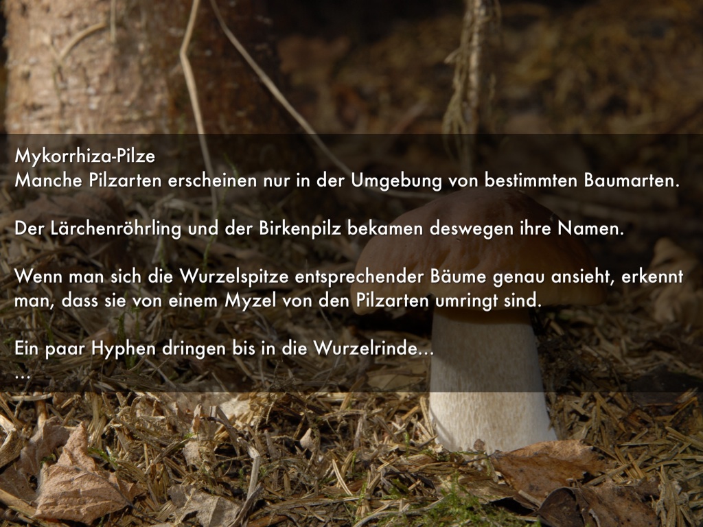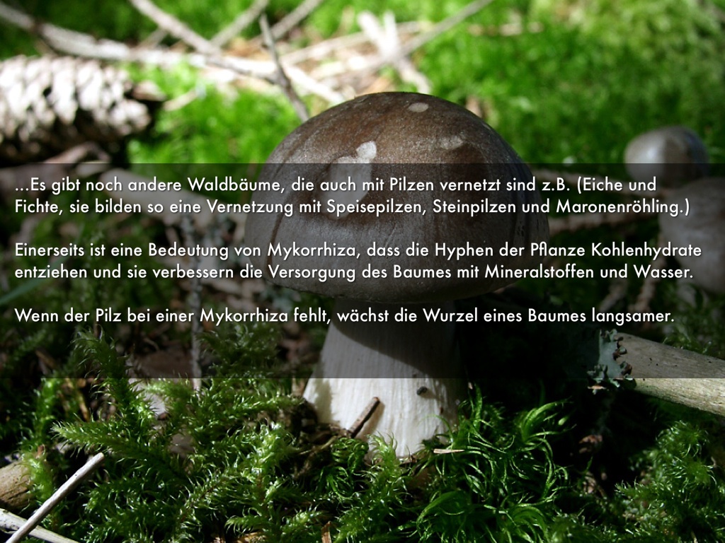 ...Es gibt noch andere Waldbäume, die auch mit Pilzen vernetzt sind z.B. (Eiche und Fichte, sie bilden so eine Vernetzung mit Speisepilzen, Steinpilzen und Maronenröhling.)