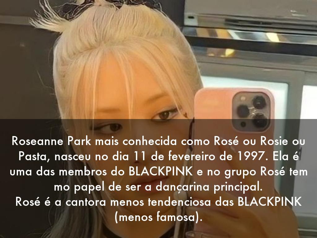 Roseanne Park mais conhecida como Rosé ou Rosie ou Pasta, nasceu no dia 11 de fevereiro de 1997. Ela é uma das membros do BLACKPINK e no grupo Rosé tem mo papel de ser a dançarina principal. Rosé é a cantora menos tendenciosa das BLACKPINK (menos famosa).